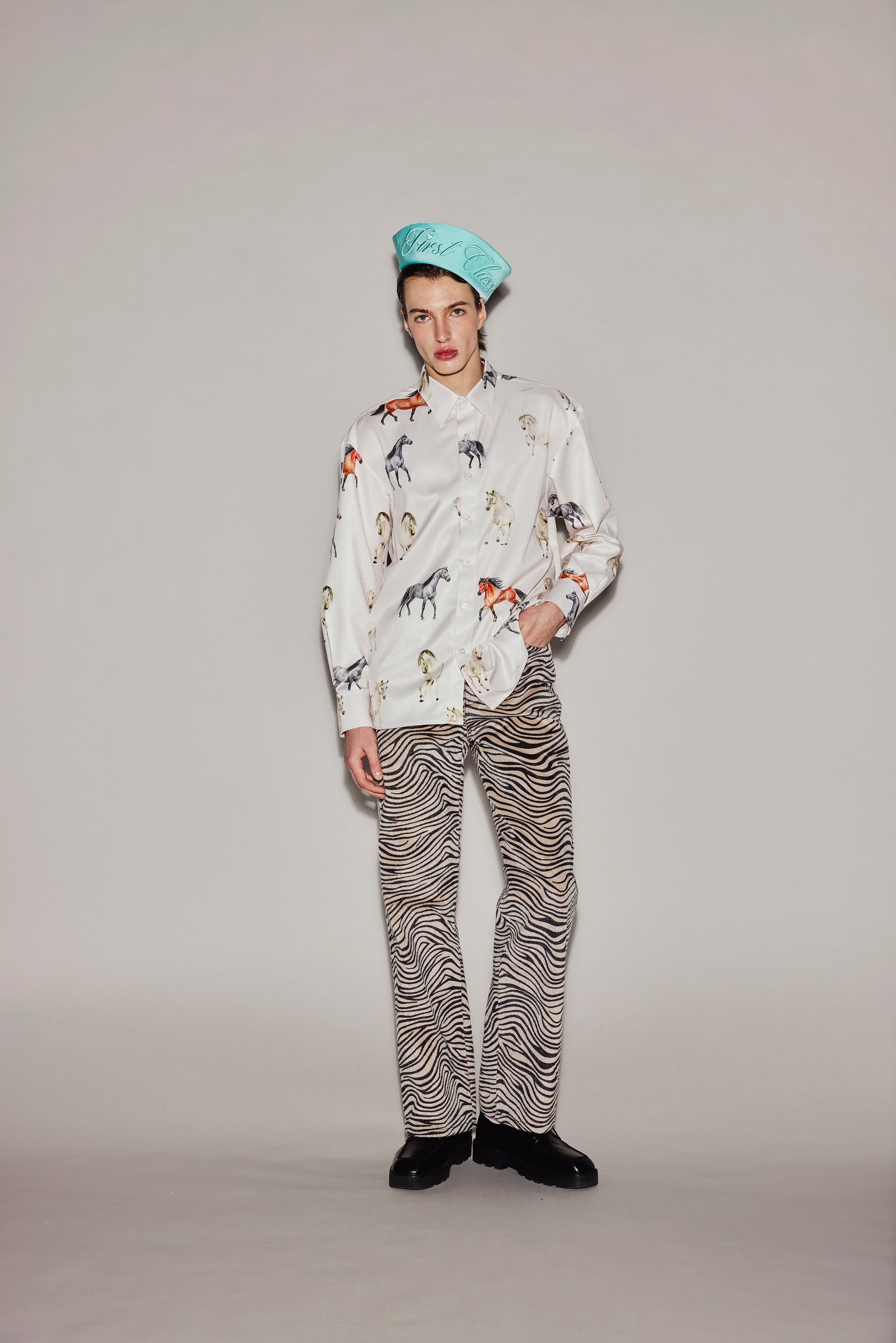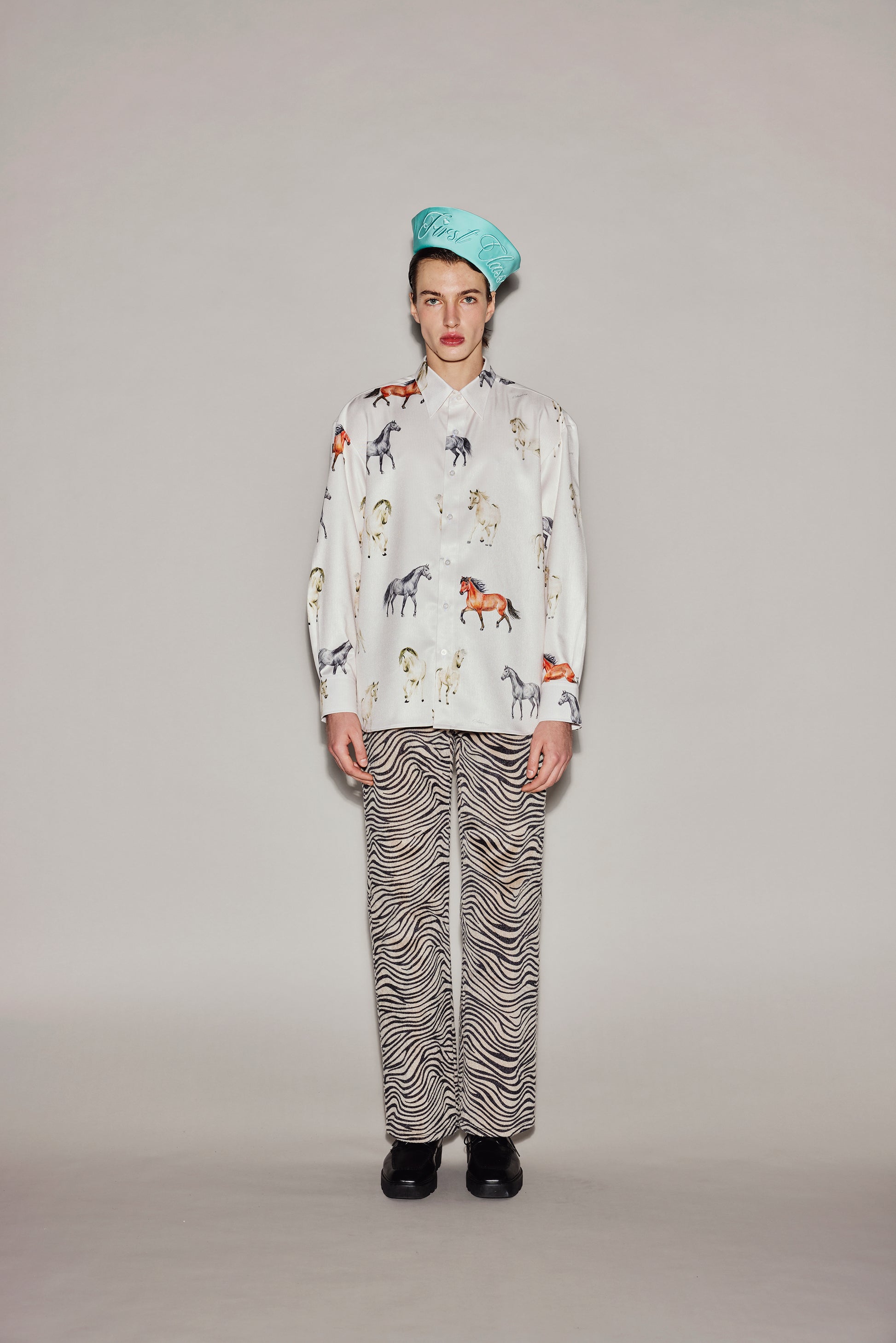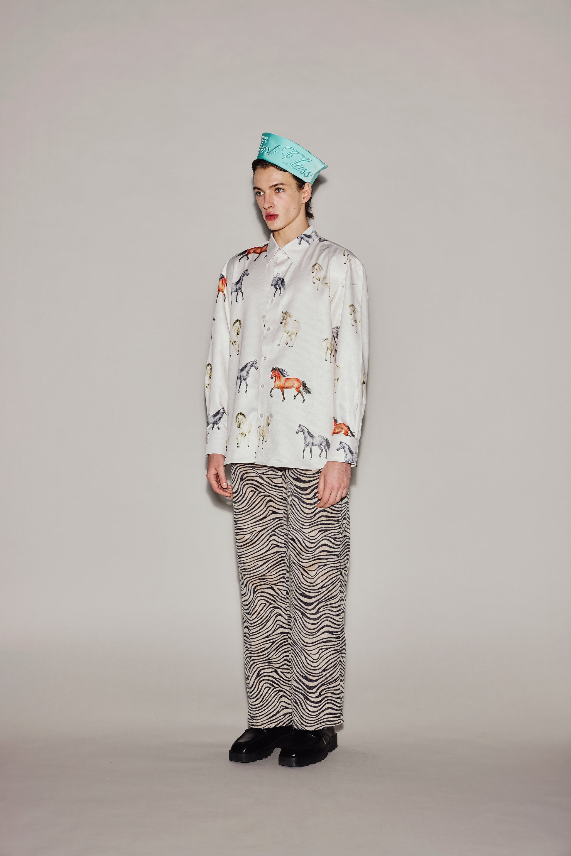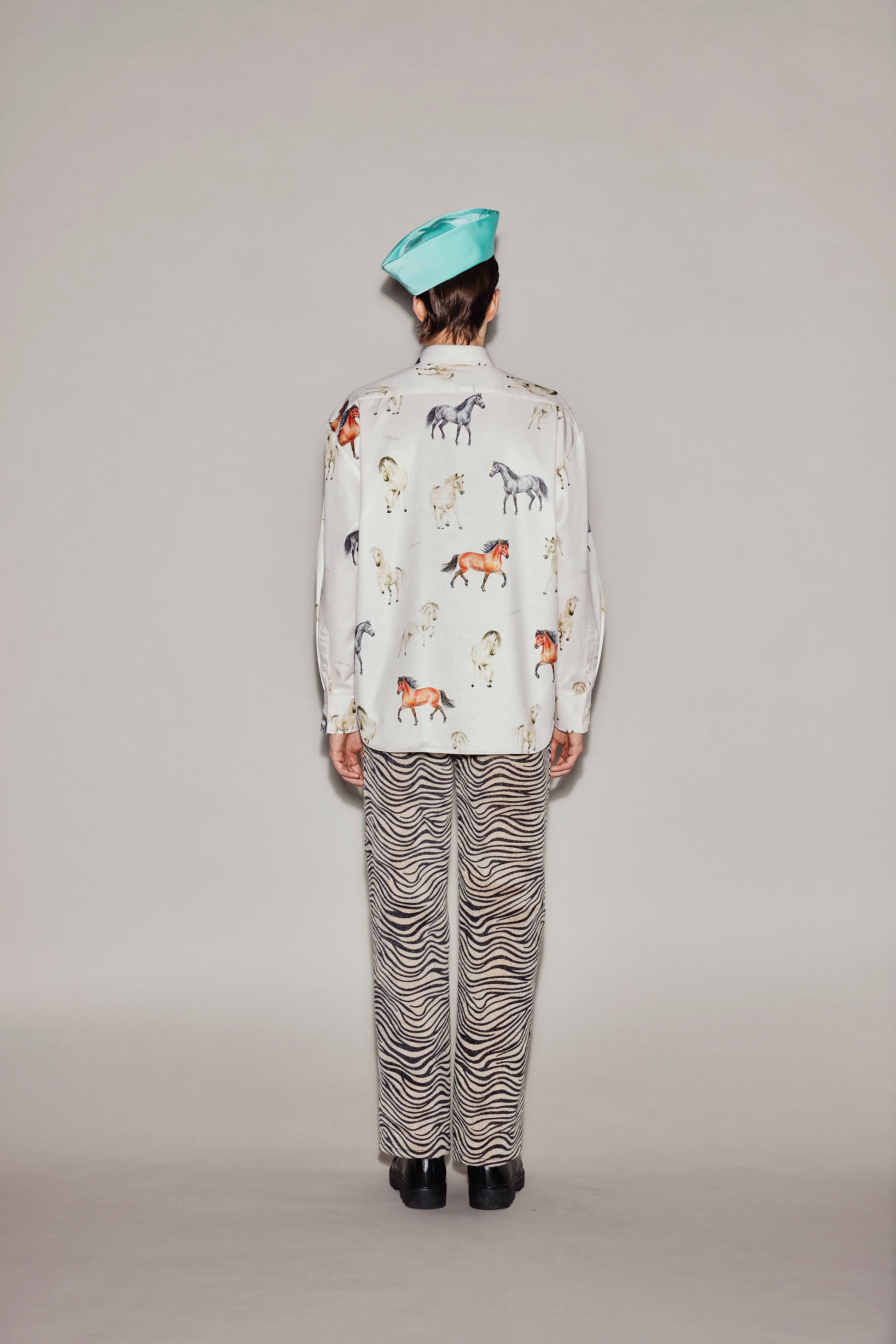 This shirt is made of digitally printed polyester fabric featuring a newly designed, hand-drawn horse motif, and is meticulously crafted.
