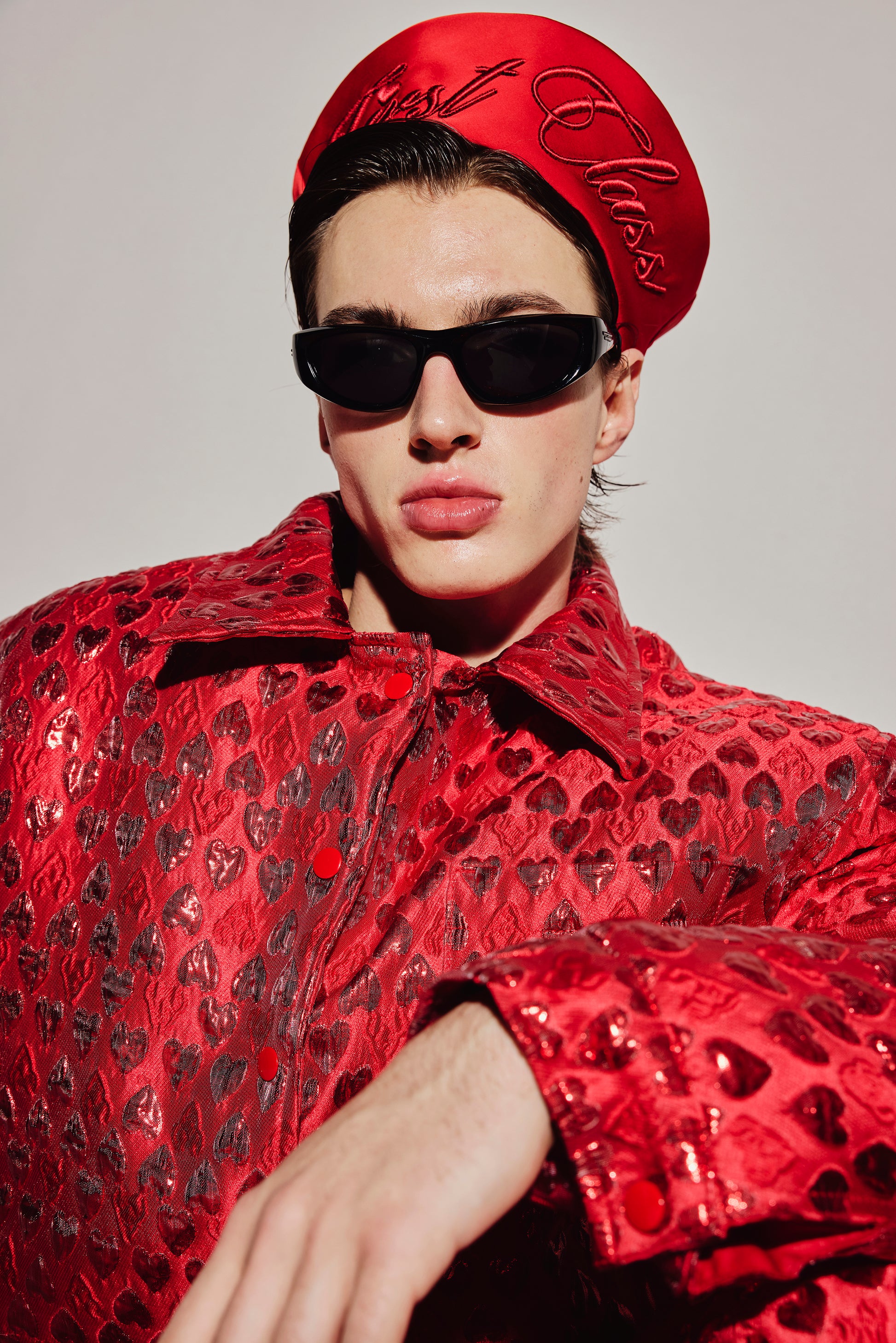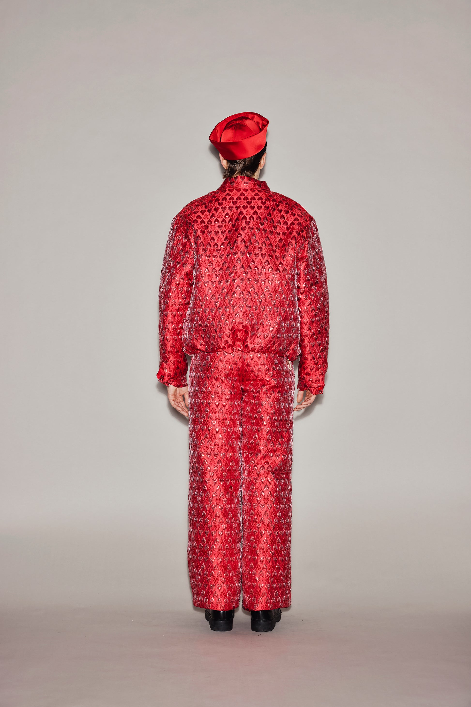 An oversized jacquard jacket with a red heart pattern, thickly padded for warmth, and with a puffy, balloon-like shape.