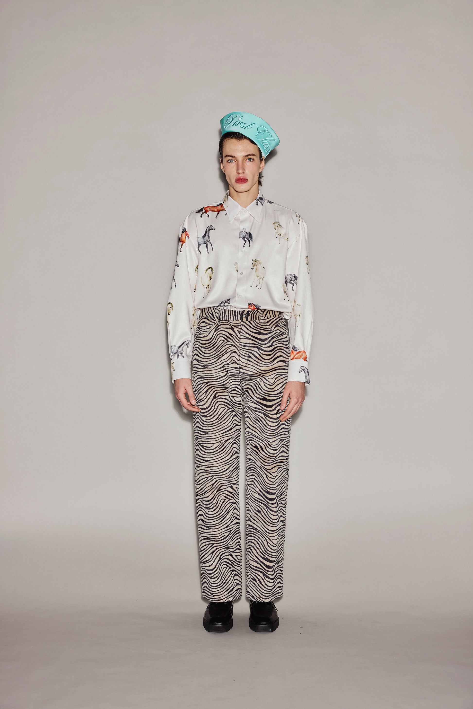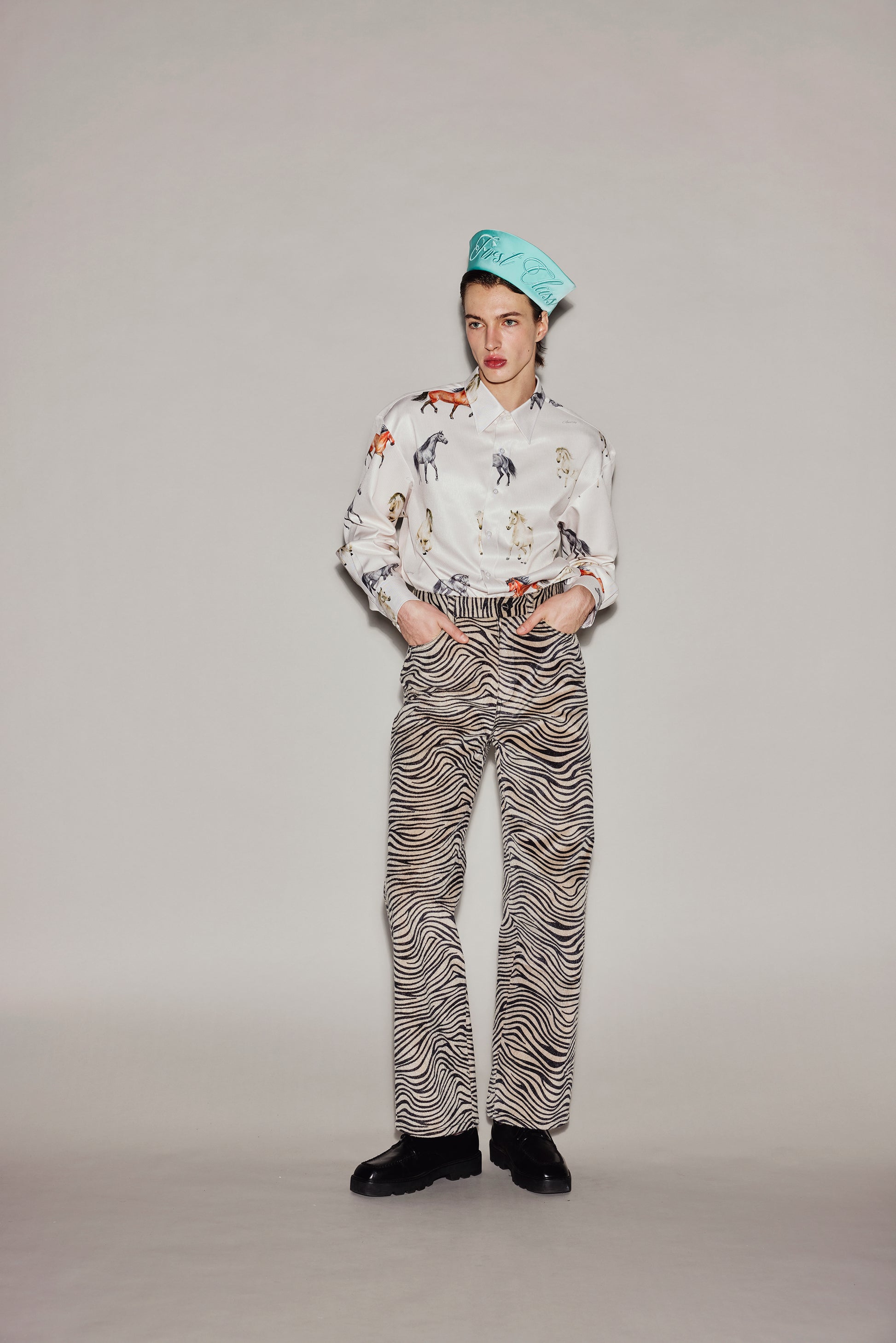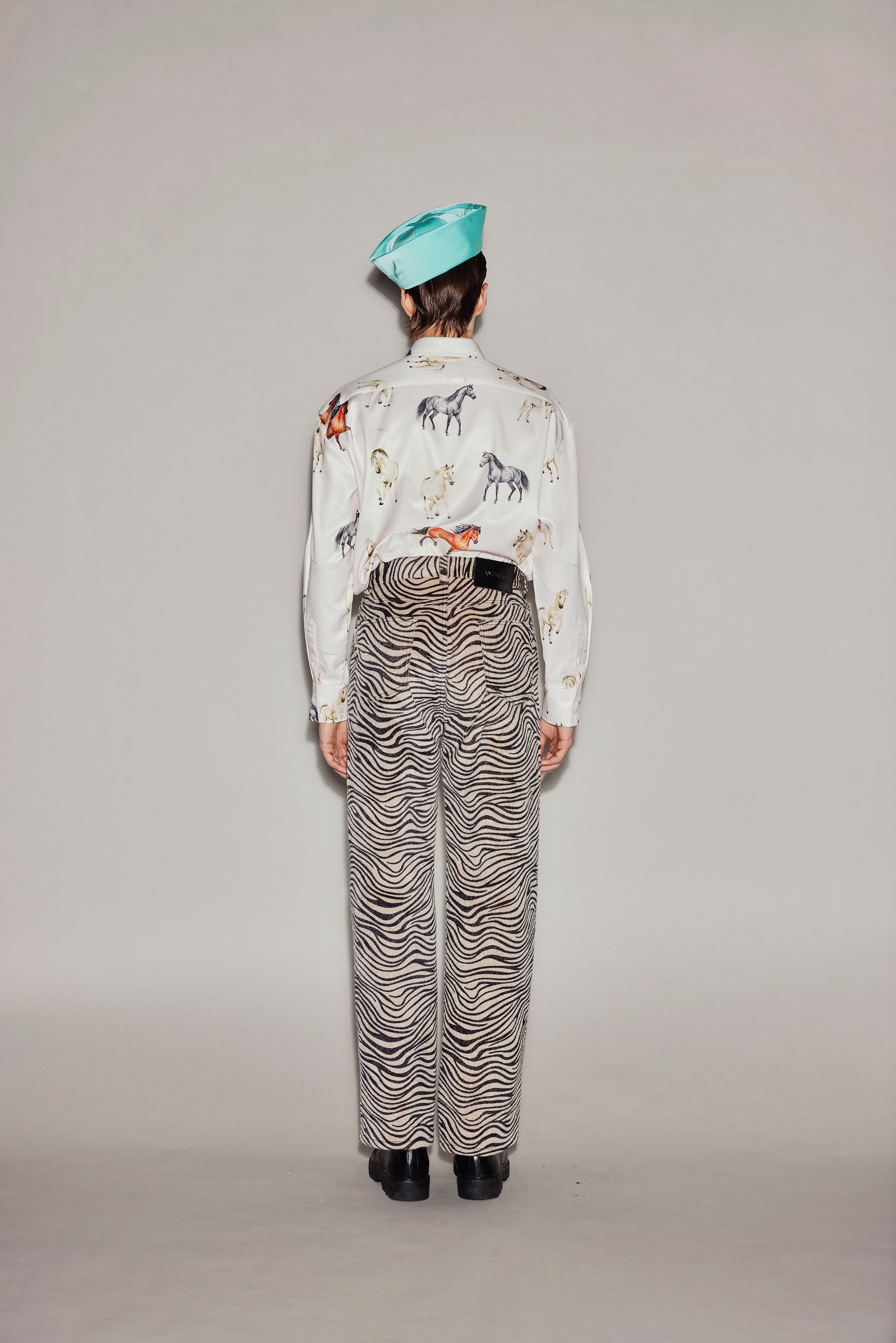 These custom-made horsehair leather pants feature a zebra pattern and a horsehair-like texture.