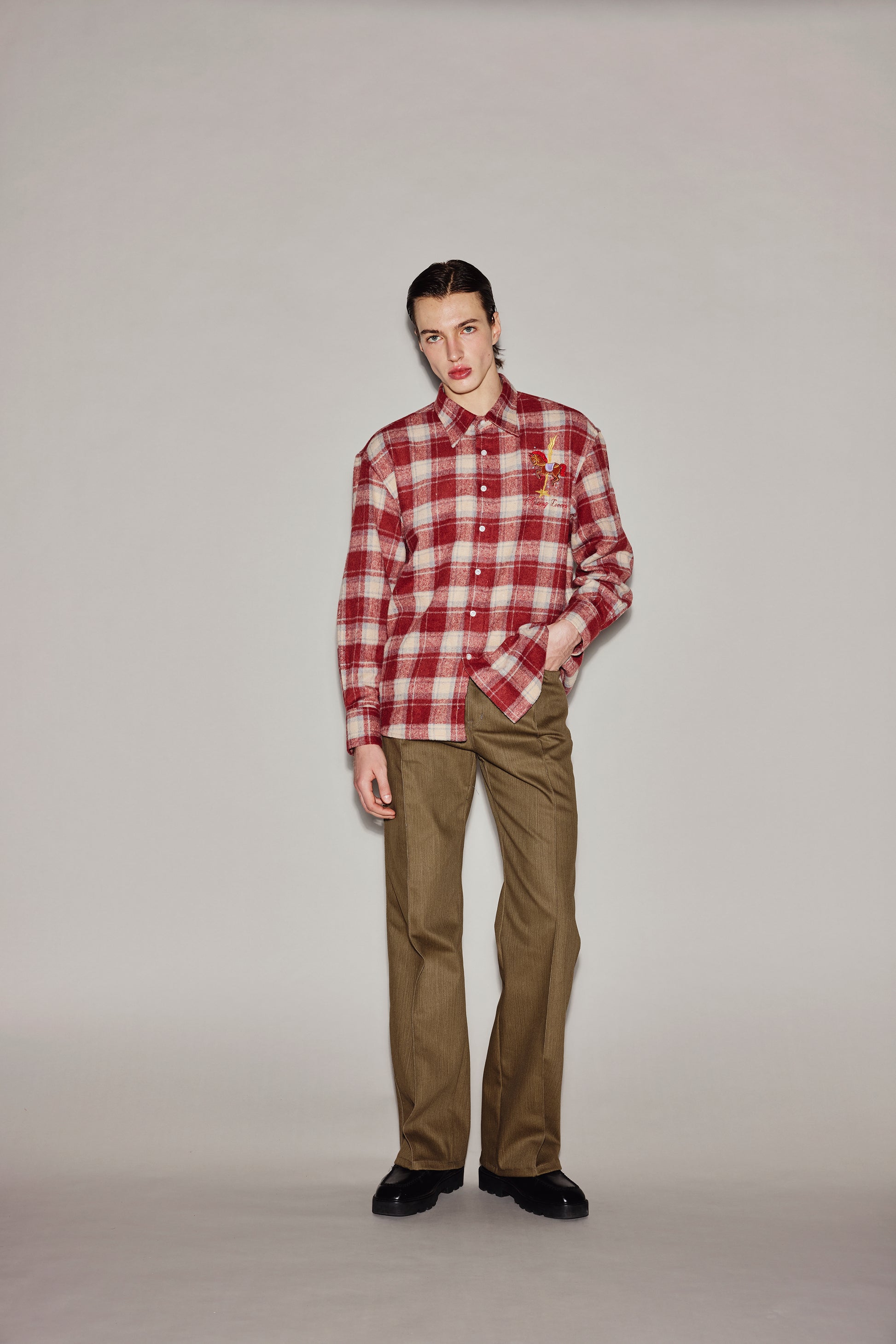 A long-sleeved red plaid shirt made of thick, soft fabric with an excellent feel. It features embroidered horse motifs in silk and faux horsehair.