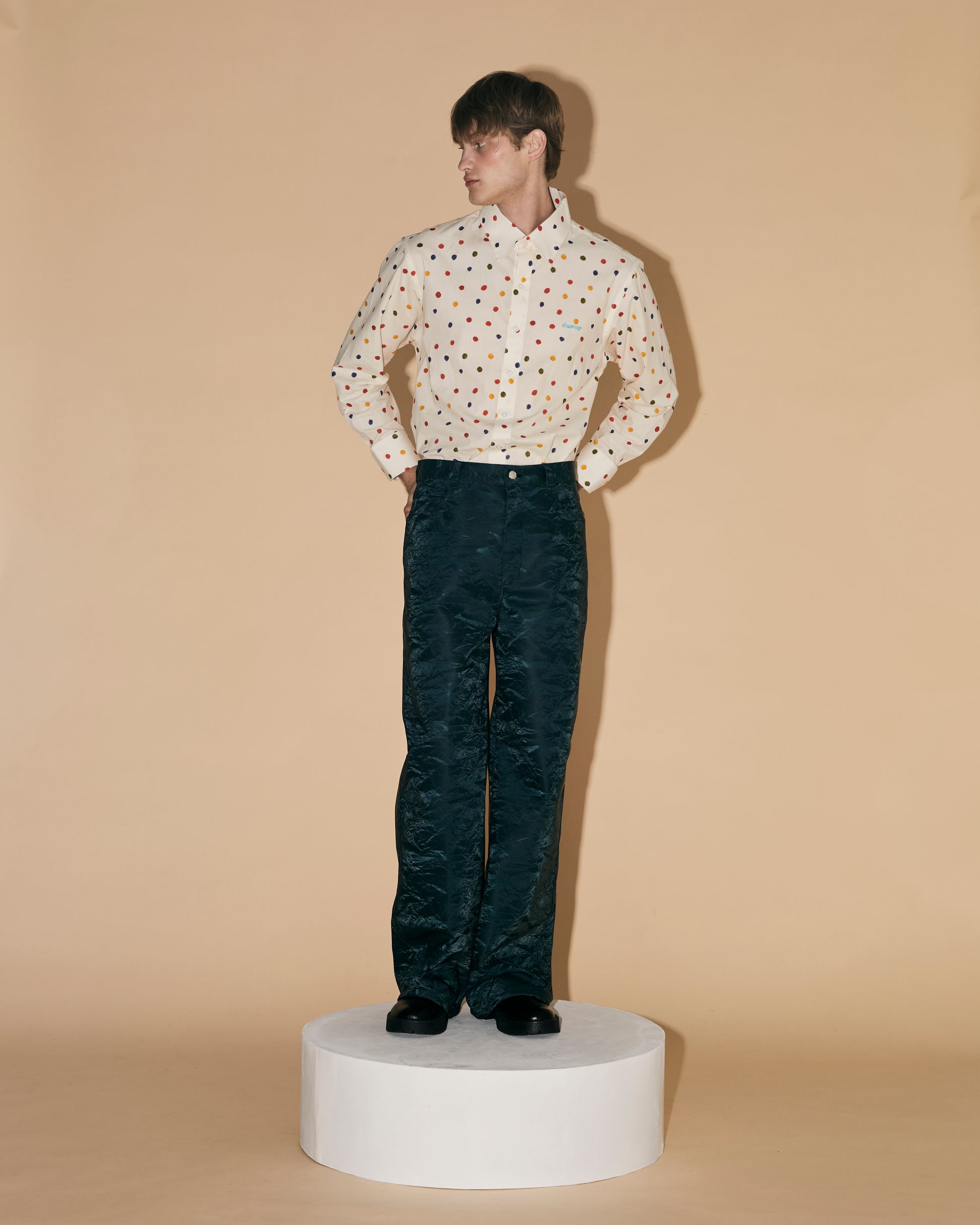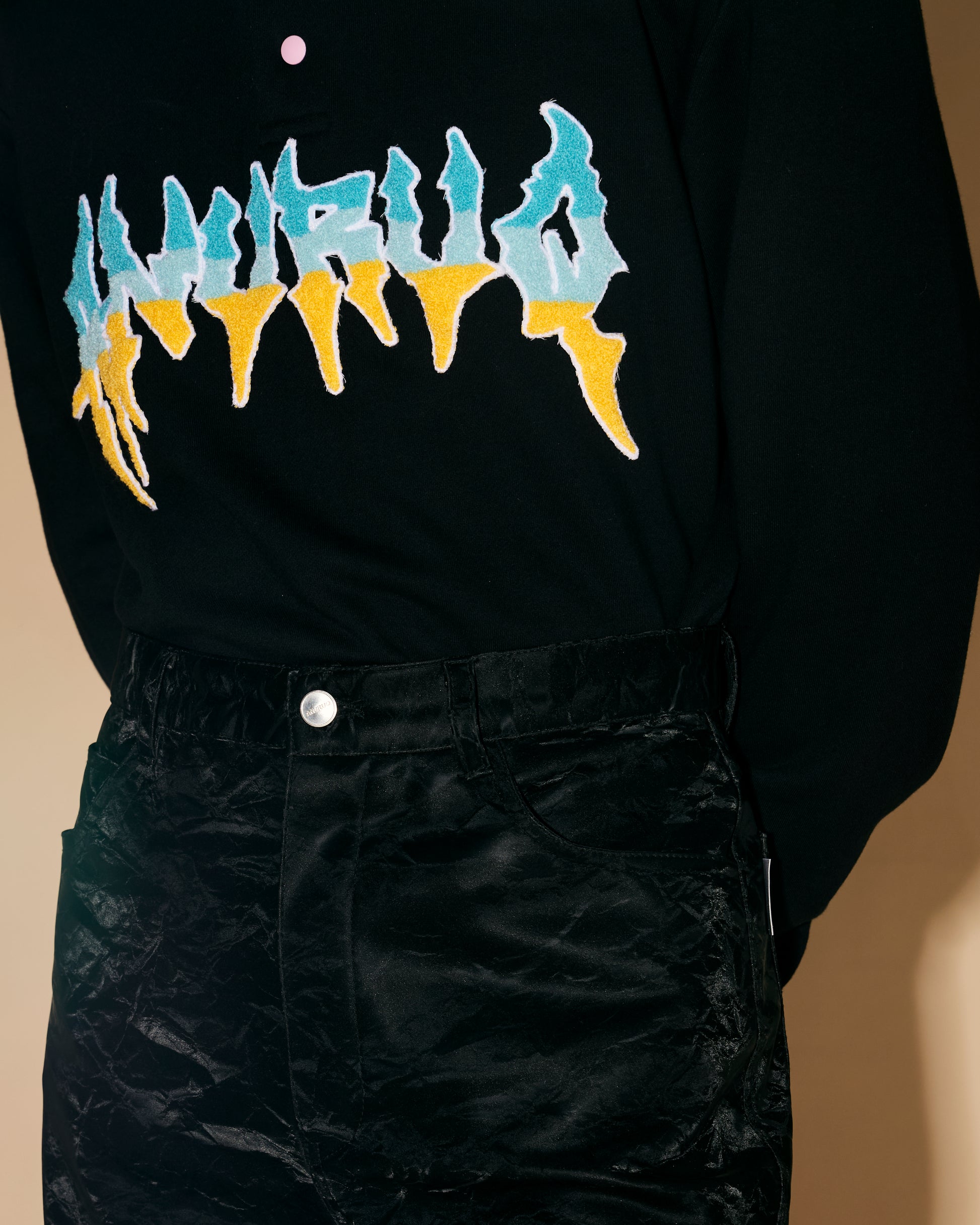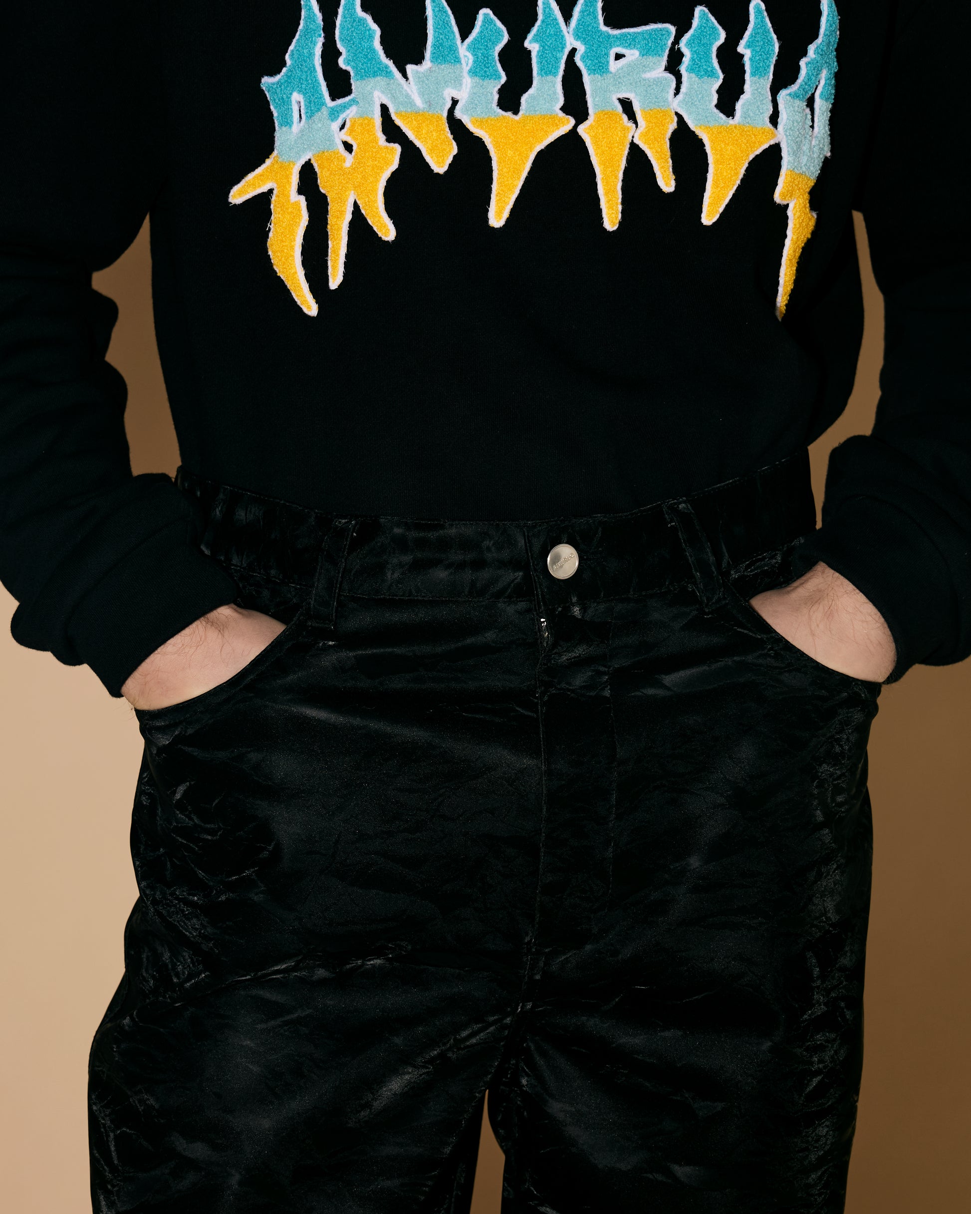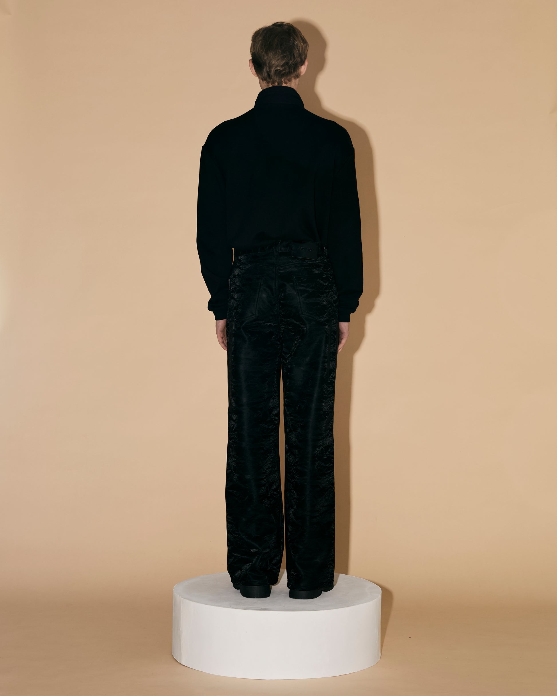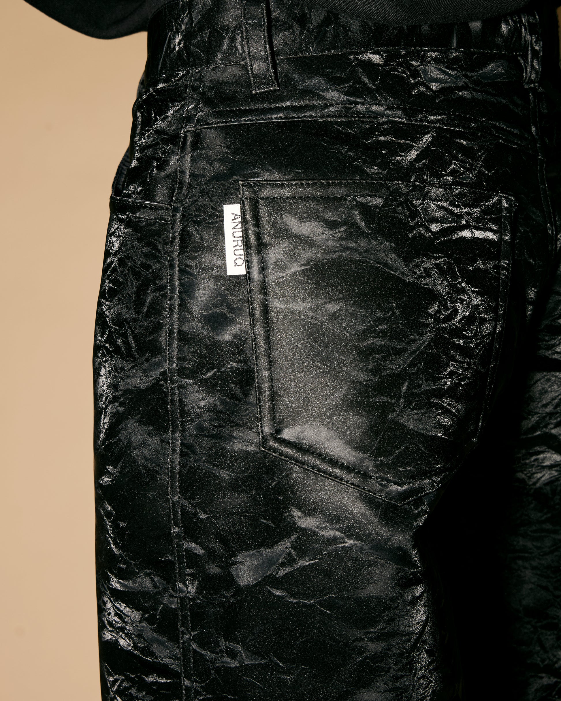 These leather pants are made from synthetic leather with a silk-like texture and a special finish that gives them a soft feel and a subtle sheen.