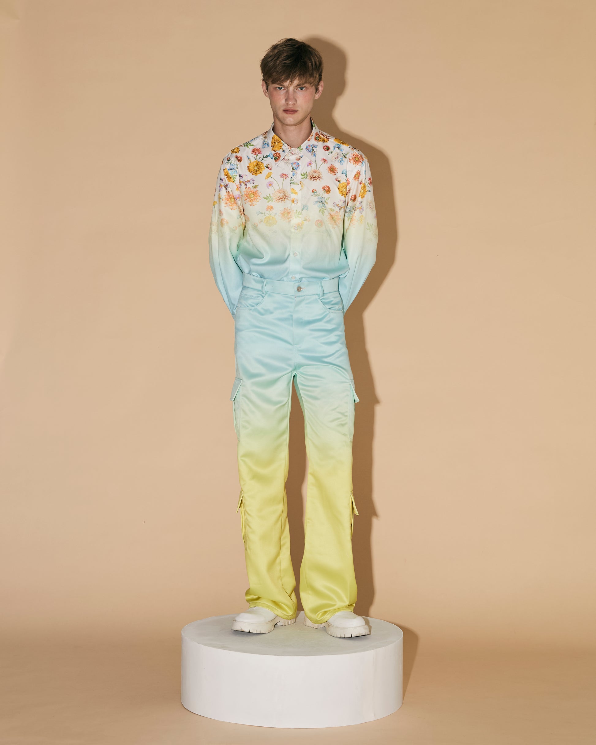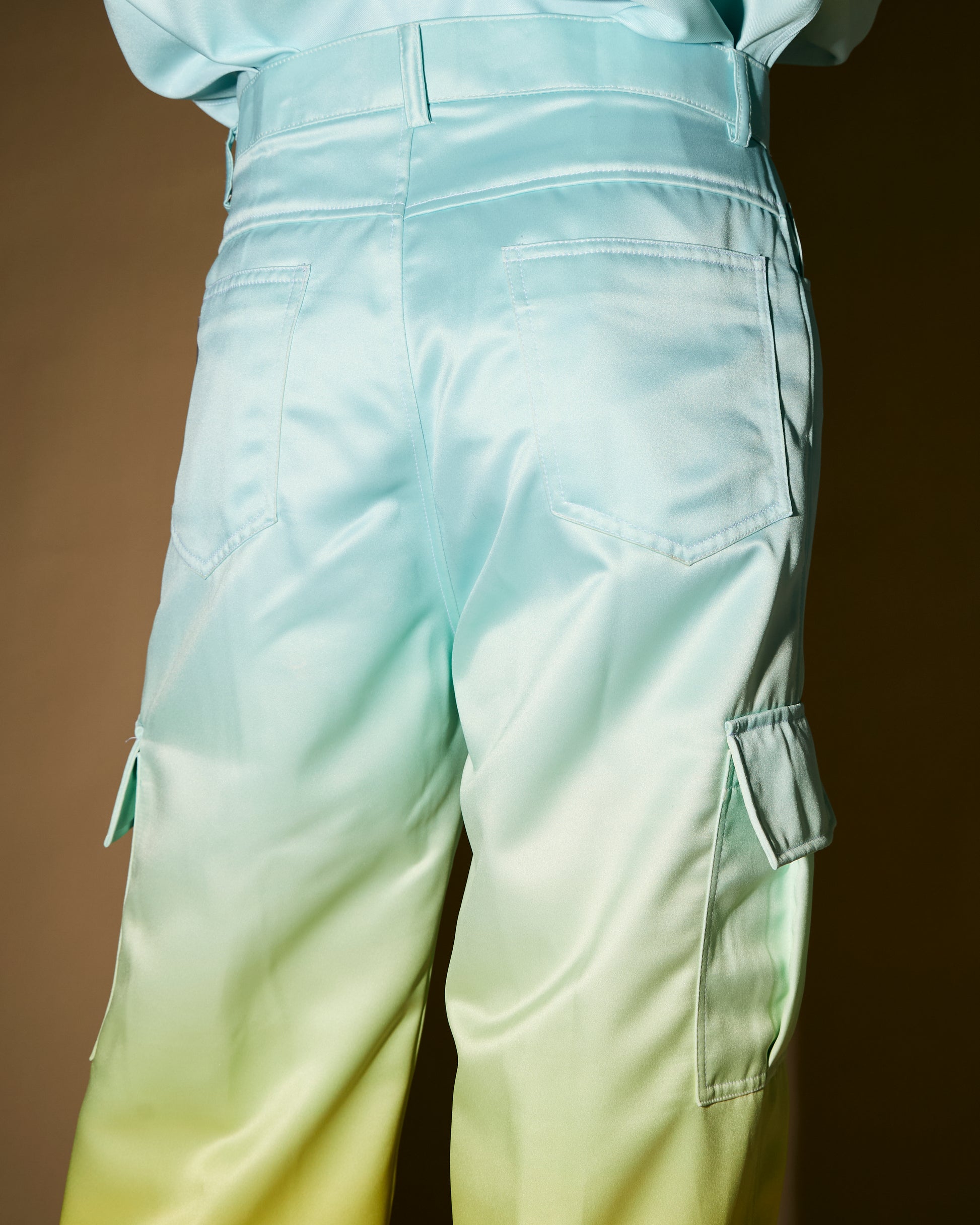 Satin cargo pants with digital gradient print technique.