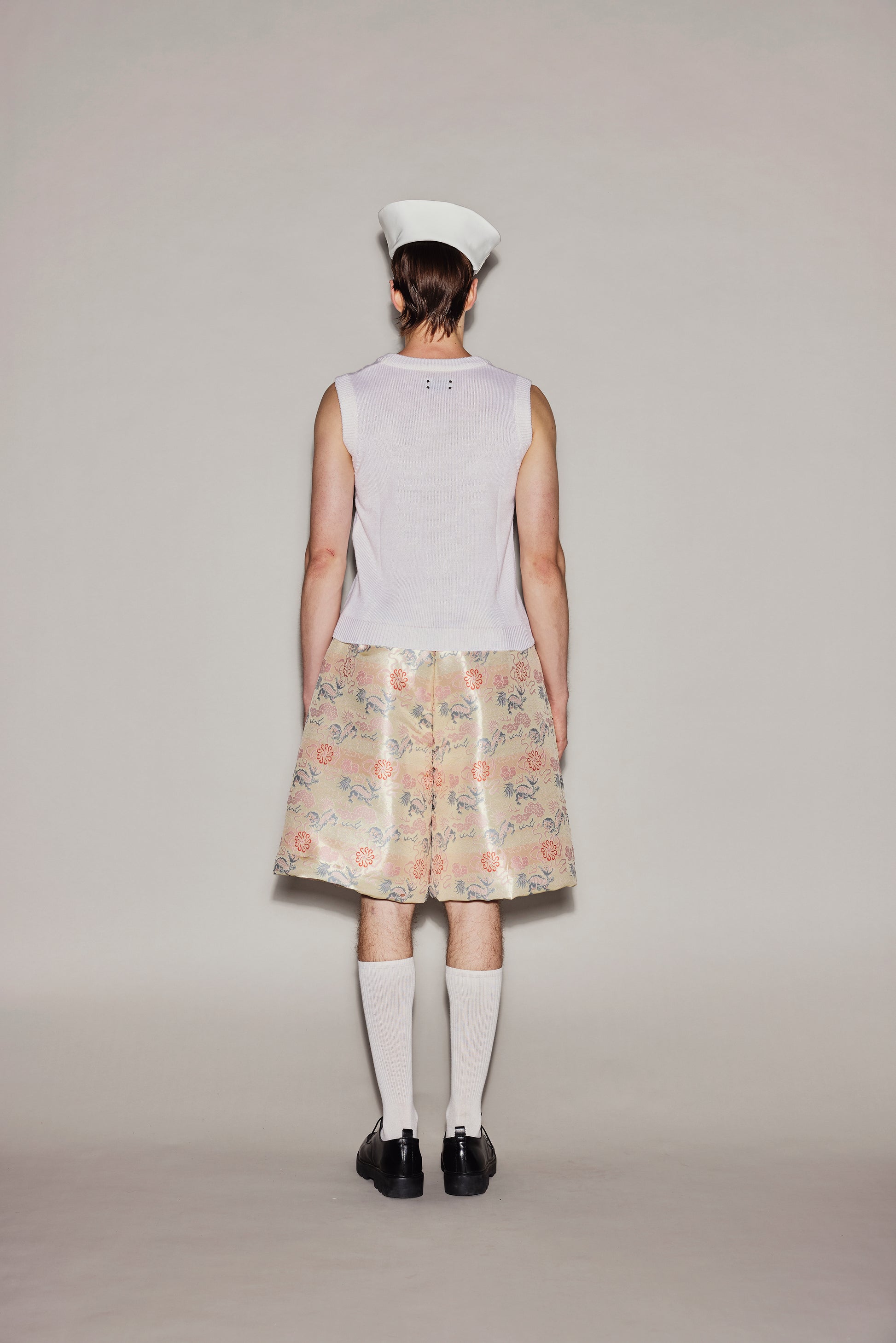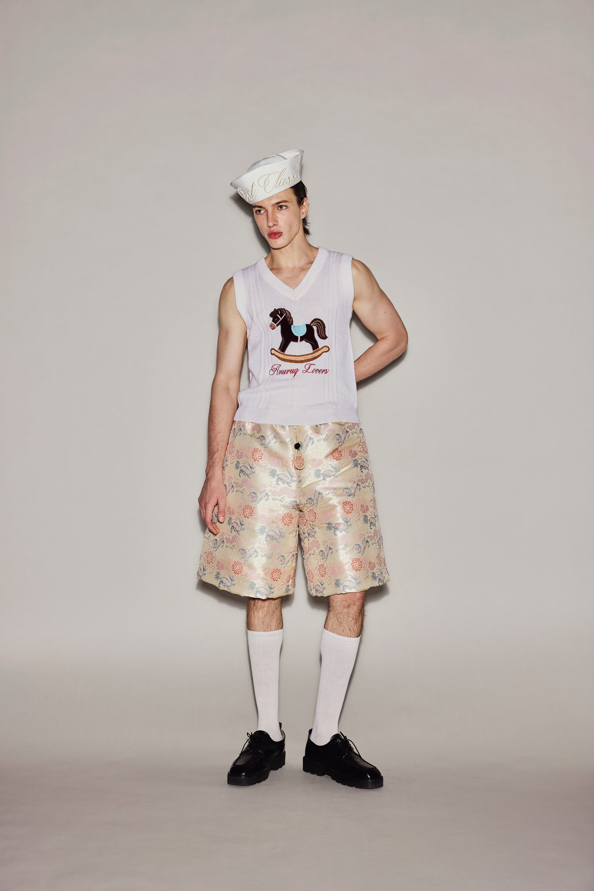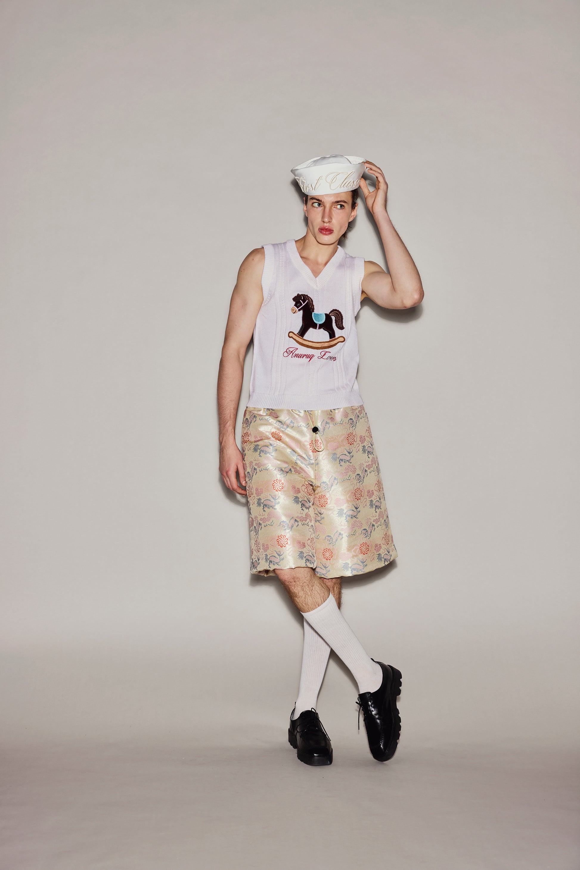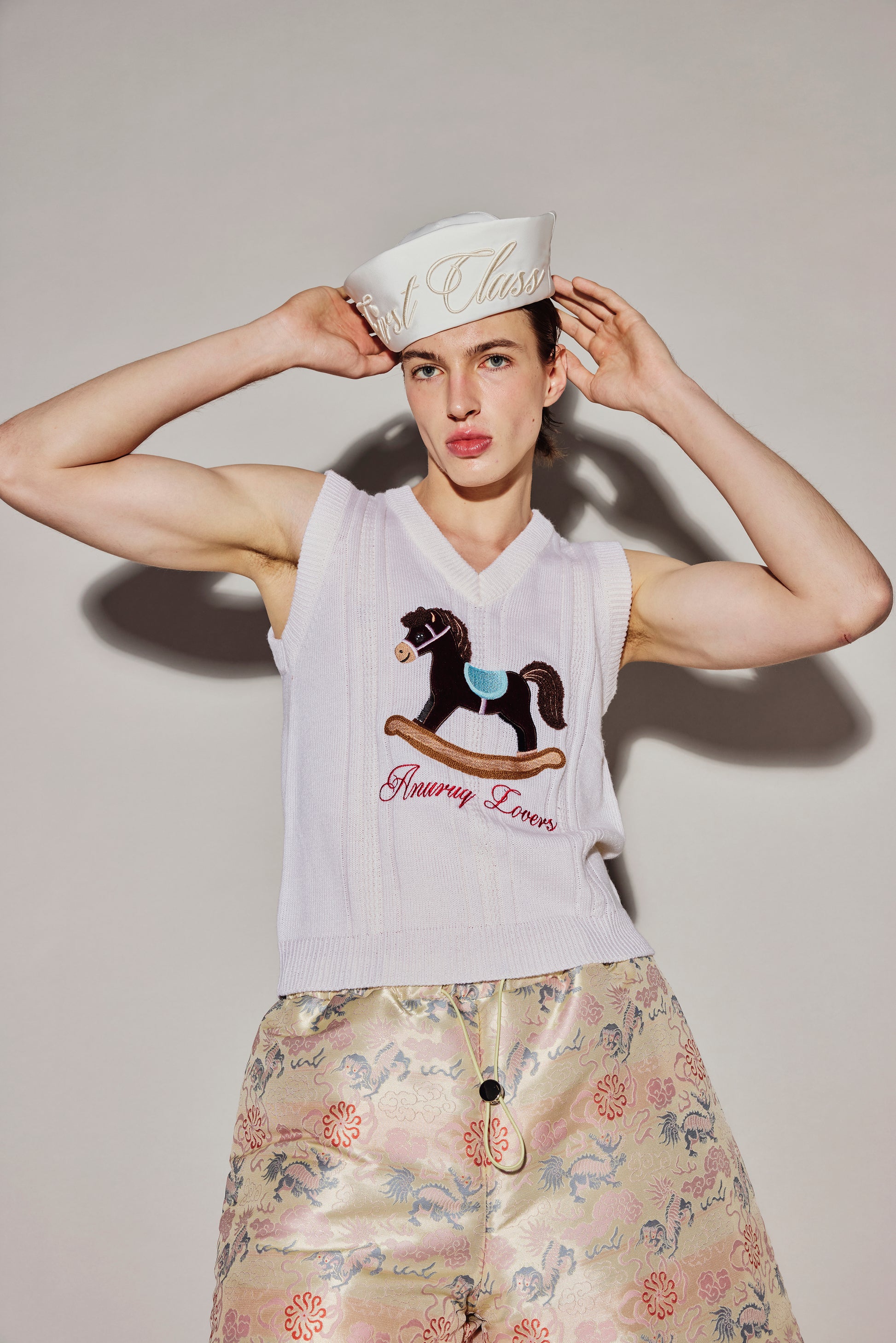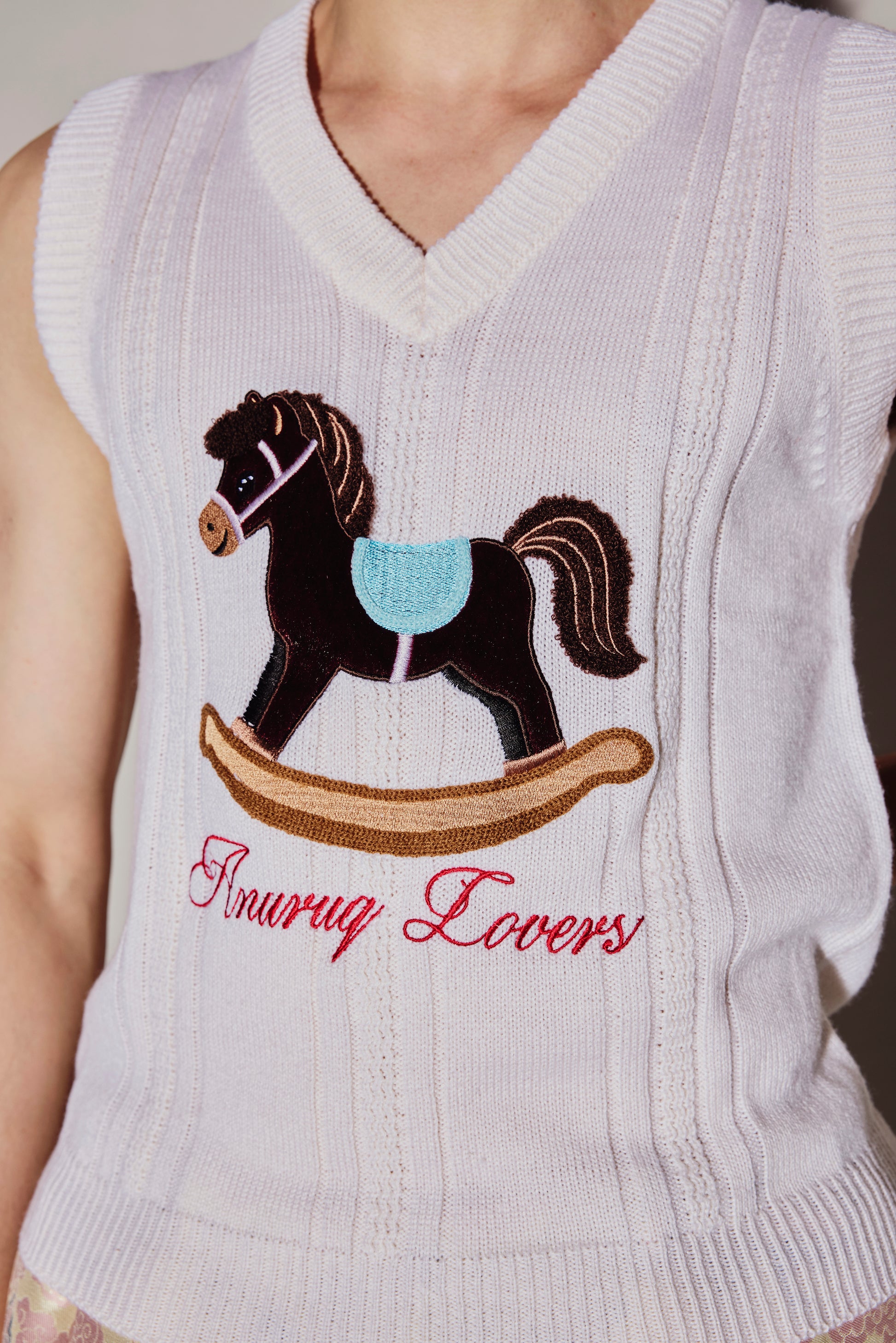 White sleeveless knitted top, embroidered with silk and horse hair in a rocking horse pattern.